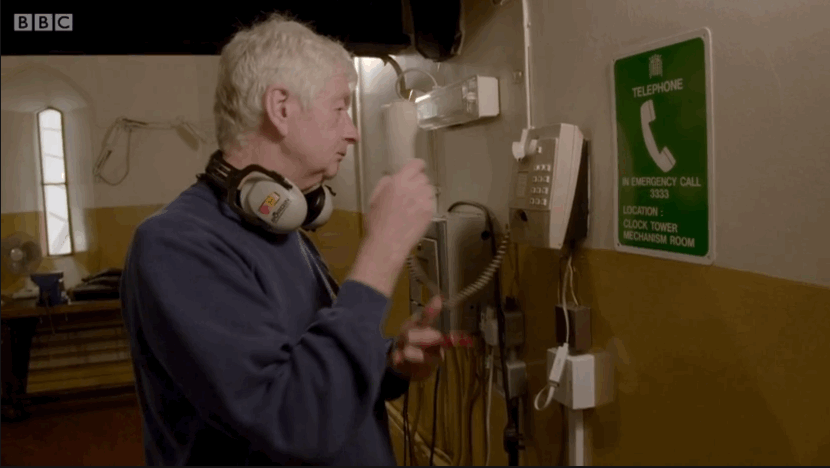 Para se certificar que o relógio está funcionando corretamente, um dos engenheiros pega um telefone comum e liga para o “Hora Certa” inglês para confirmar se as batidas dos sinos estão sincronizadas!