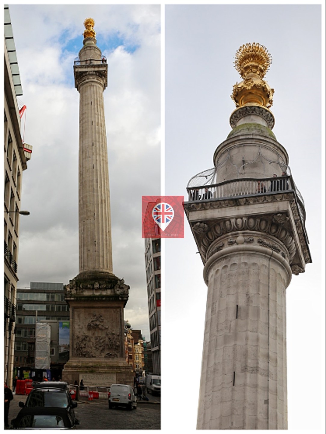 The Monument é uma coluna que foi erguida para lembrar o Grande Incêndio de Londres, em 1666 O monumento tem 62 metros de altura e se for colocado na horizontal a ponta cairá exatamente no local onde o fogo começou, uma padaria na Pudding Lane. A curiosidade: Mais gente morreu por causa do monumento do que no Grande